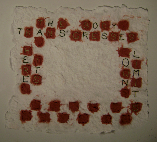 This exhibition is concerned with the exchange of words as well as the food and drink which facilitate dialogue. The table cloth and napkins emblazoned with iconic red and white checkers, bear texts which reflect on both dinning events and the politics of cooking and food. The goods consumed at a meal are the end result of a chain of events involving transactions between workers and employers producers and consumers. The embroidered napkins propose toasts inspired by recent occurrences in the artists life and contemporary sensibilities, the pulp paint napkins bear snippets of Mikhail Bakhtin's commentary on banquet culture in the late Middle Ages.