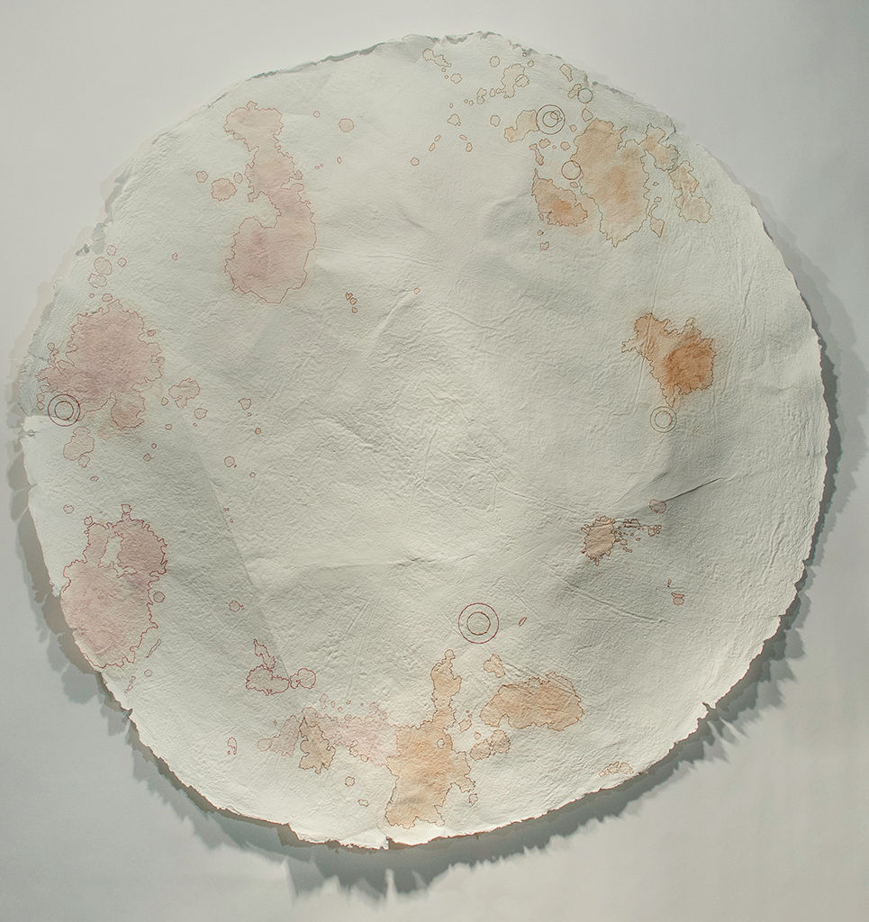 The maps displayed in Table Top Cosmologies, are the result of events hosted during a residency at the Banff Centre. The two 60 inch pieces on view contrast the relationships between carousers at an art opening and those between servers and guests at a mock tea party. The white cotton table cloth bears the stains left behind by participants of a game of Taboo, as they were served by hosts, dressed like servers at the Centre's dinning lounge. The weathered abaca piece maps a lively free flowing conversation over the course of a vernissage in the Philosopher's Knoll (a small gallery on the Banff campus). Both embroidery thread and acrylic ink were used to interpret the marks left behind.